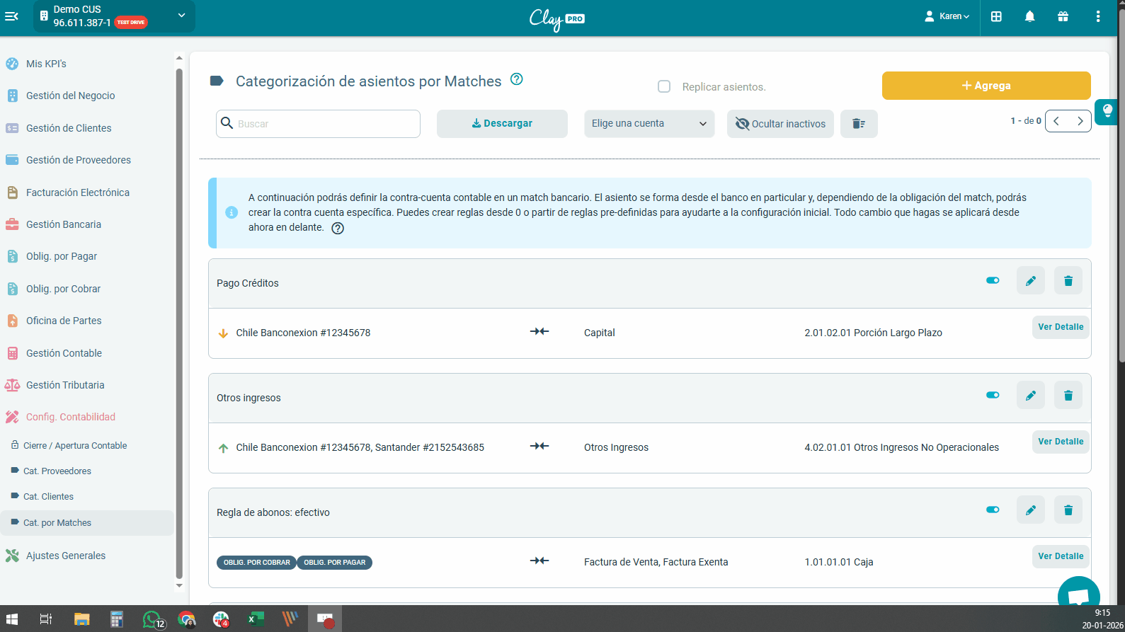 Desde ahí podrás crear, editar y gestionar todas las reglas que determinan cómo Cassius contabiliza los matches y los abonos asociados a los movimientos bancarios.