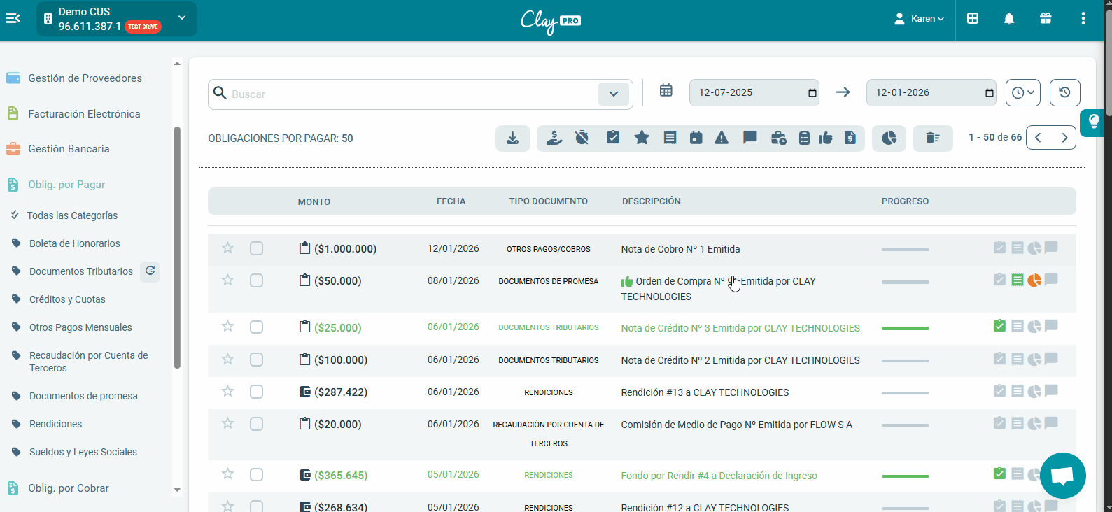 Agregamos un botón de “Actualizar RCV” directamente en el menú de Obligaciones, visible tanto para por cobrar como por pagar, identificado con el ícono de reloj.