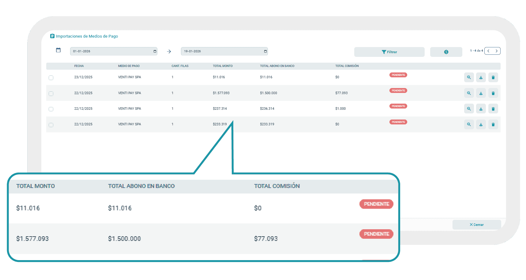 Facilita el match entre depósitos bancarios y ventas.