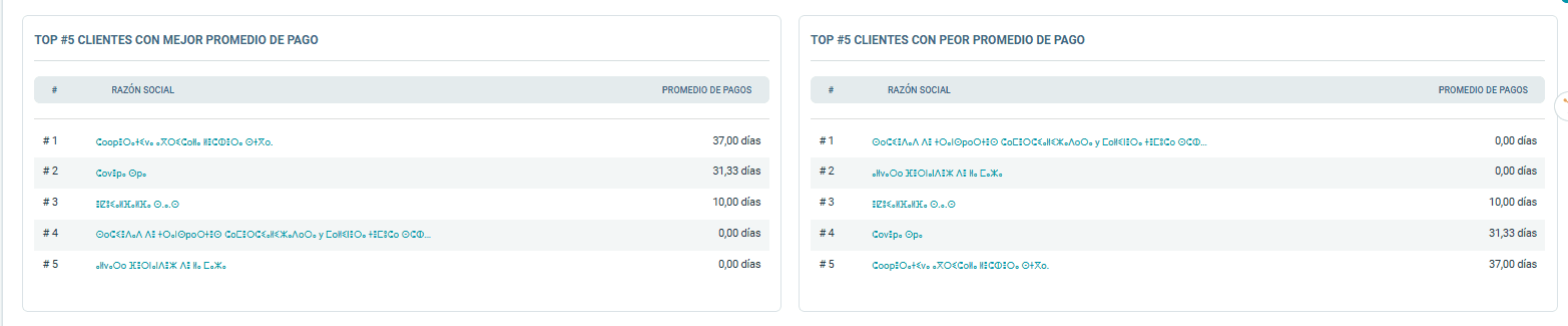 Nuevo: Ahora, además del Top 5 de clientes por cobrar, podrás visualizar el Top 5 de clientes con mejor promedio de pago y el Top 5 de clientes con peor promedio de pago.